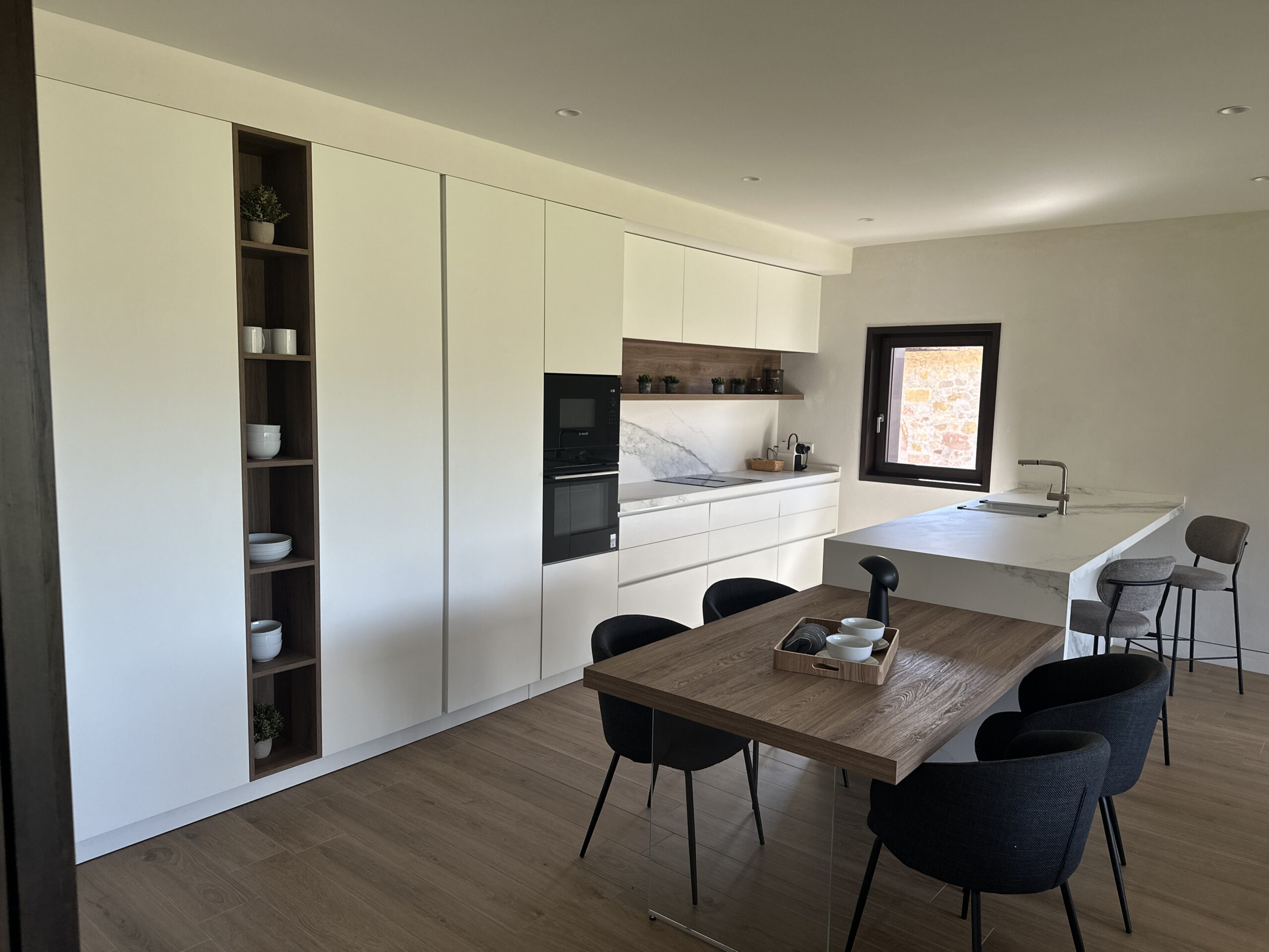 El proyecto apuesta por el uso de materiales nobles y naturales, como la piedra o la madera, y por una arquitectura que respeta y dialoga con el paisaje, cuidando especialmente su integración con el Palacio de Nevares.