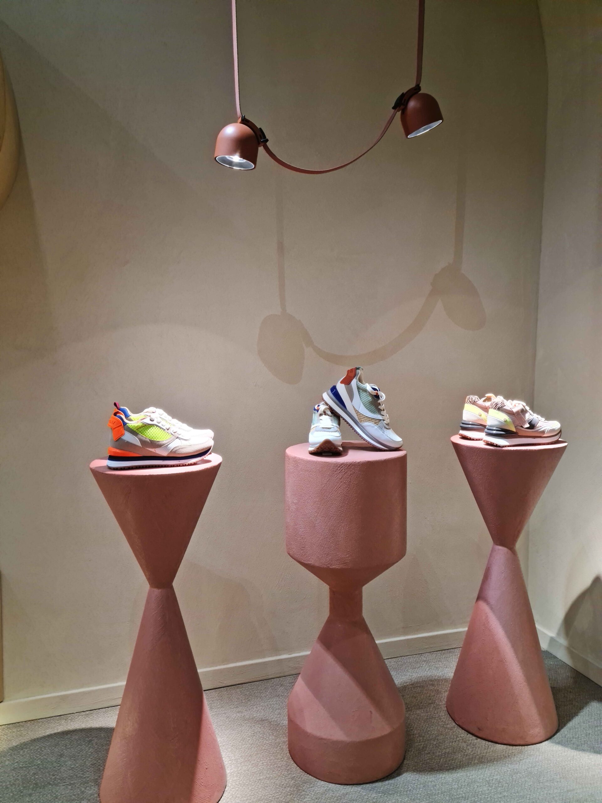 La forma rectangular y estrecha de la tienda actual permite crear un espacio con todos sus elementos expositores con formas curvas, potenciando dichas formas con la textura que proporciona ecoclay ROCK en tres colores, en los paramentos se ha utilizado un color neutro ecoclay paintROCK Olite castle y para el mobiliario orgánico se ha optado por dos colores; Tierra de Campos countryside y Jerte cherry, todo el recorrido del espacio está acompañado de una iluminación fantástica.